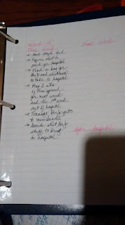 Yesterday, my BuJo fell off the shelf and the binder broke. The rings won’t close. My sweetie was out and about today and he bought me a new one. I think I will need to stow it in a drawer when I am not using it.  Besides, I need to make a space for it that is not on a shelf because I won’t be able to reach higher than my head for at least a month post-op. I am bringing it to the hospital with me, so I can have them 3 hole punch all the paperwork they will give me and I can put it directly into my Bullet Journal and it will not get lost.